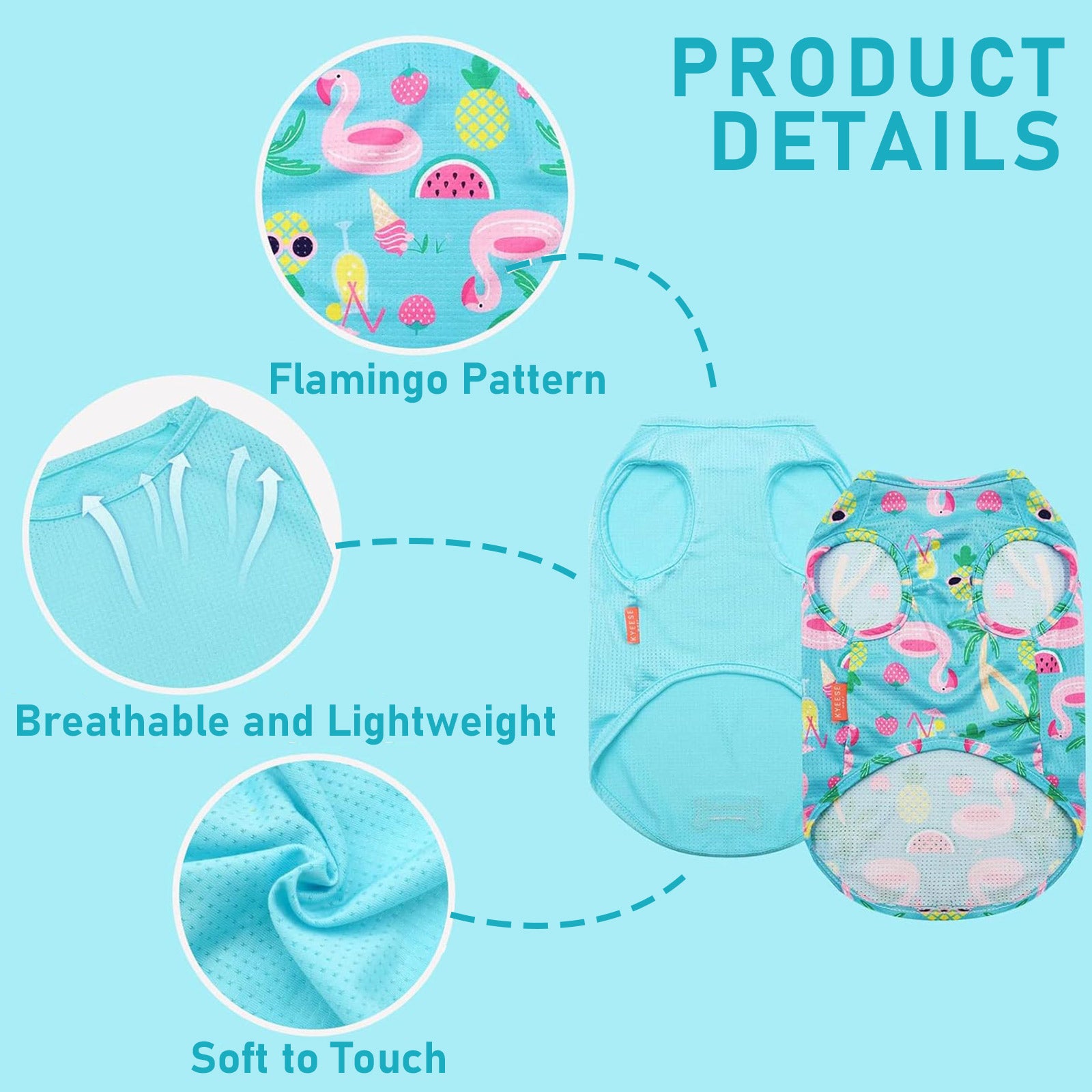 LIGHTWEIGHT & BREATHABLE--kyeese dog shirts are made from mesh fabric, features as breathable, lightweight and quick dry, and pullover design, easy to put on and take off. DETAILS-ORIENTED--Vivid flamingo pattern dog shirt with a bone-shaped reflective label on the back, walking safely at night. Ribbed elastic on arm holes for comfort fit.