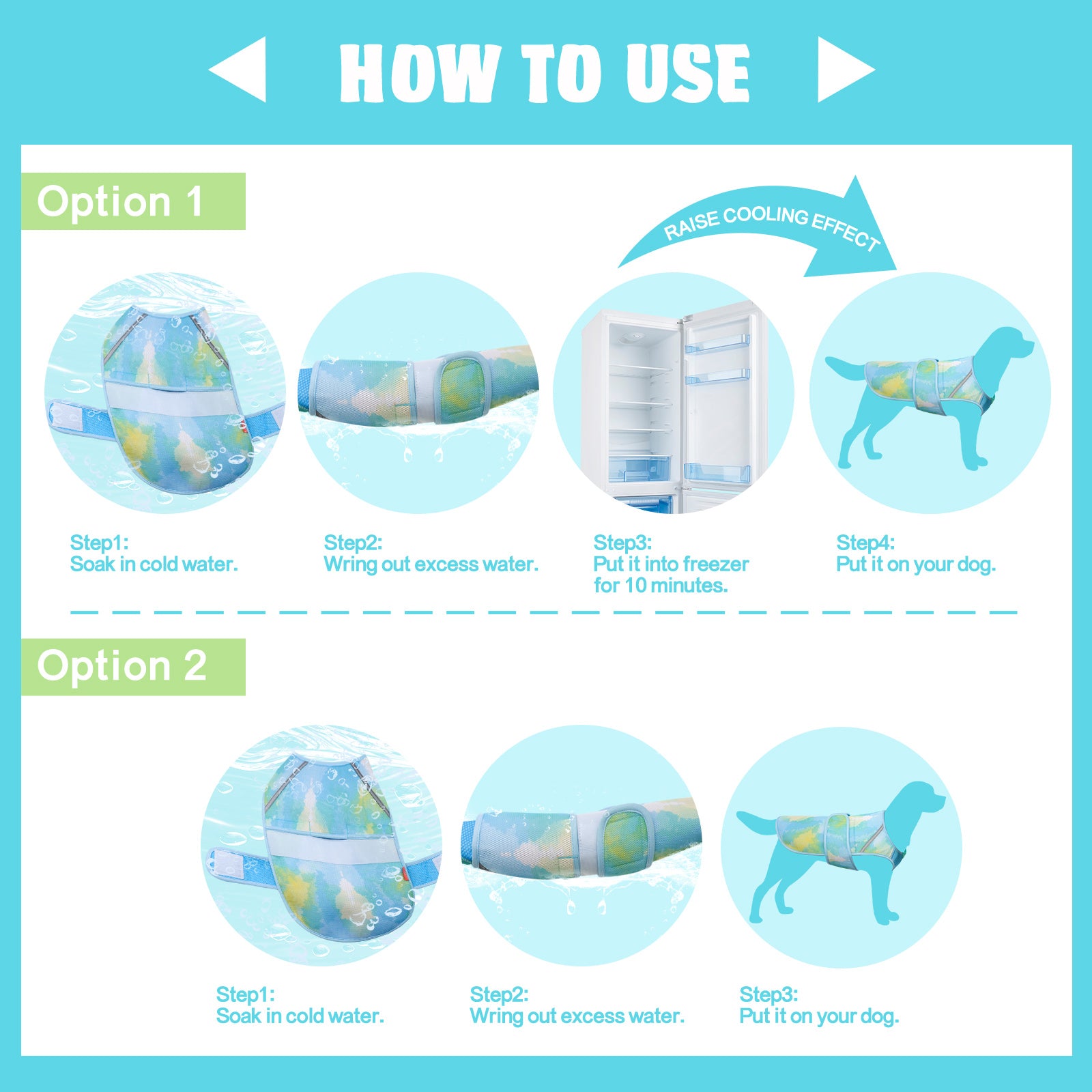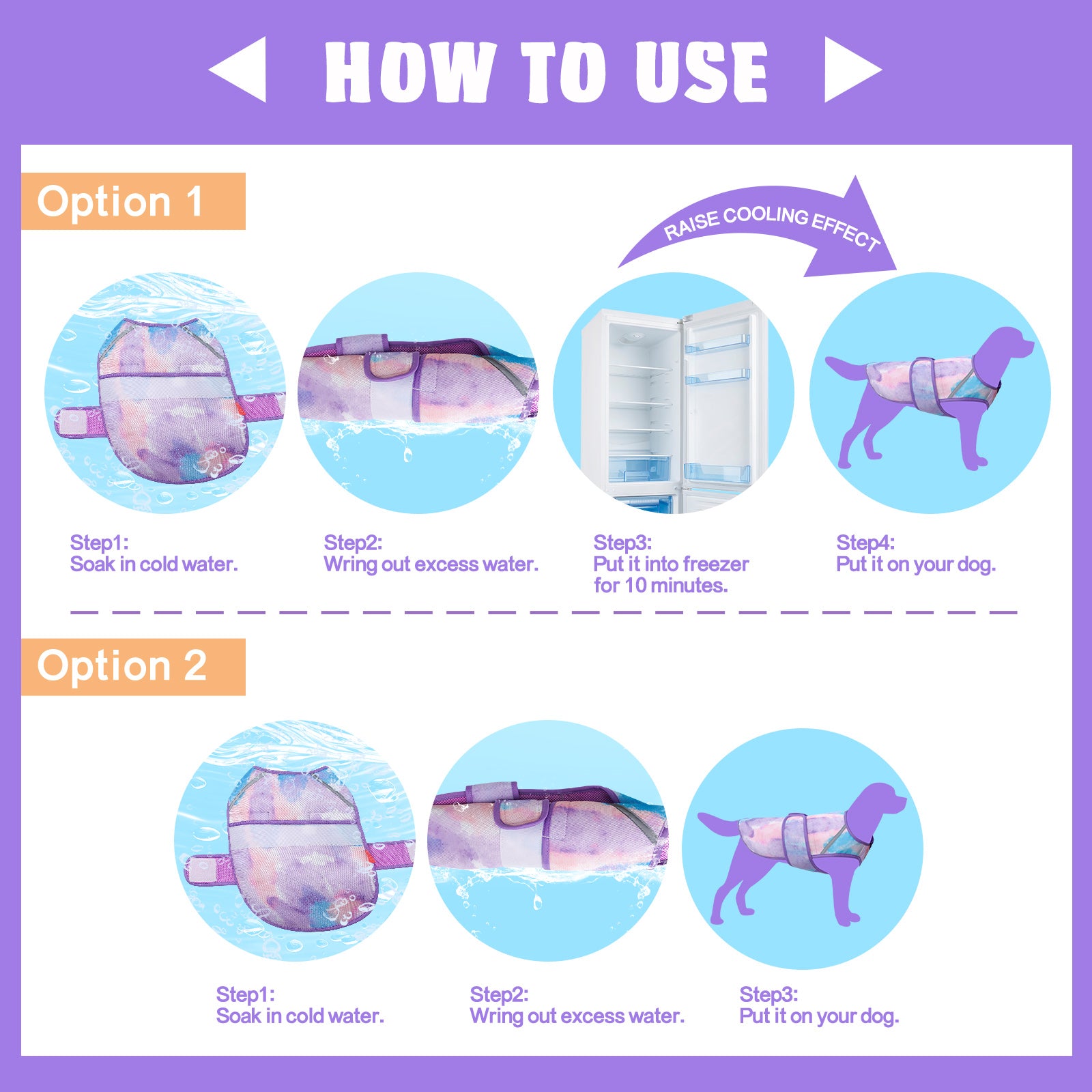 EASY TO USE--Soak the dog cooling jacket in water, wring it out fully, then put it on your dog. For better cooling results, you can soak it in water and wring it dry and put it in the refrigerator for 10 minutes, and take it out to put it on your pet.